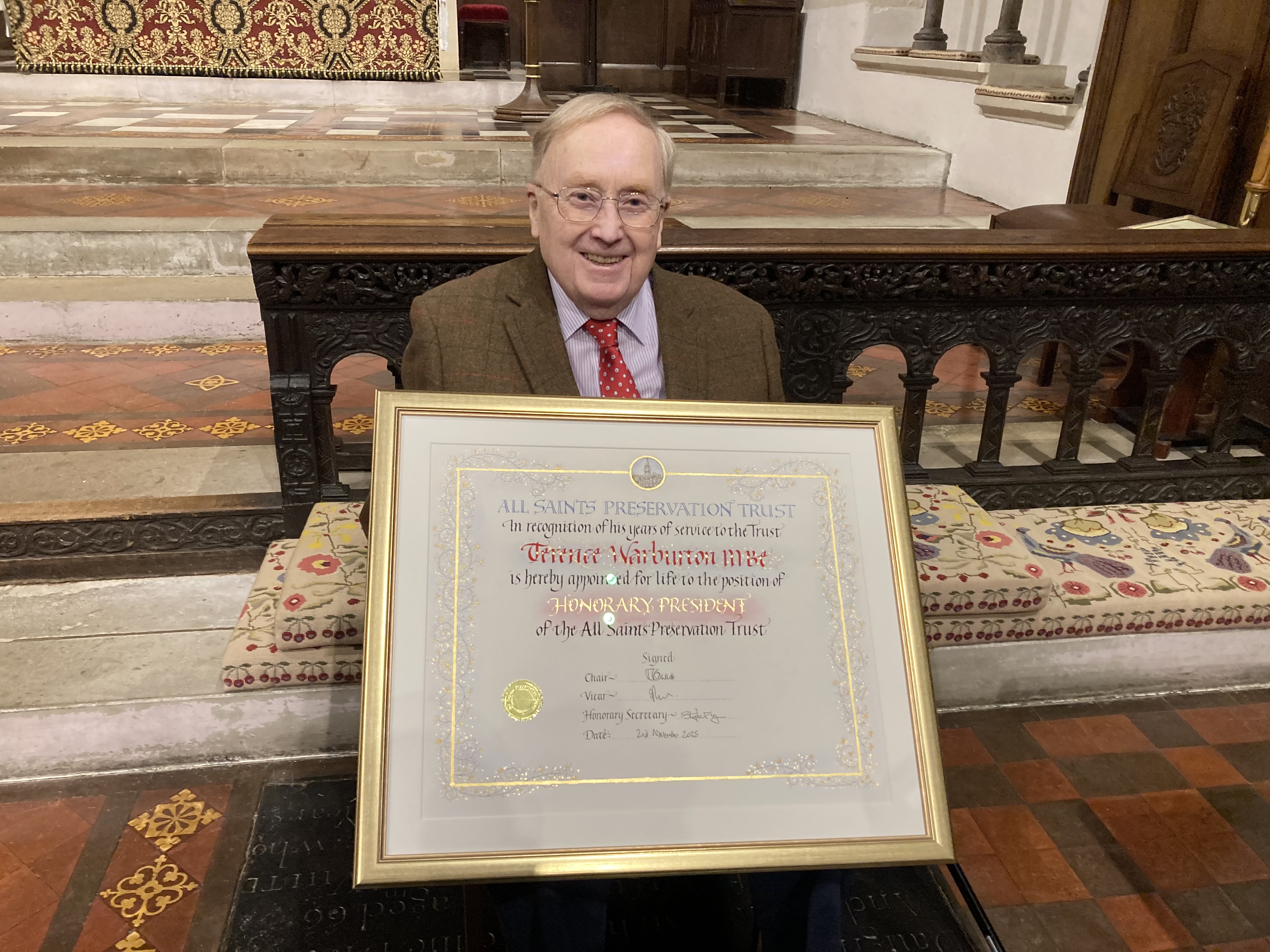 Terry Warbuton MBE, who was instrumental in the establishment of All Saints Preservation Trust, and the driving force behind the restoration of the church after the 1985 fire, was formally appointed as the Trust's President at a service in All Saints held on 2 November 2025 to commemorate 40 years since the fire . Bishop Richard made the presentation. On that day the church had also marked the Year's Mind of George Plenderleath, one of the original Trustees, who later became the Trust's first President, and is now succeded by Terry.